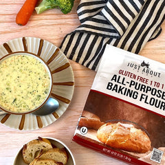 Melt butter in a large pot over medium heat. Add the Just About Foods All-Purpose Flour and whisk constantly for 2 minutes to create a roux. Slowly add the vegetable broth while whisking to prevent lumps.