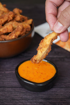 - In a pan, heat enough oil over medium heat to shallow-fry. Once hot, fry the mushroom strips in batches until golden and crispy, about 2–3 minutes per side.