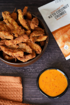 - Dredge each mushroom strip first in the cornstarch, coating it fully and shaking off theexcess. Then dip it into the egg mixture, and finally coat it with the seasoned coconut crumbs, pressing gently to help them stick.