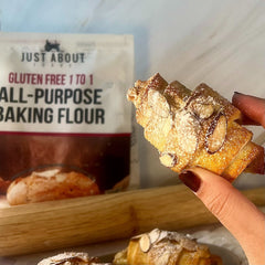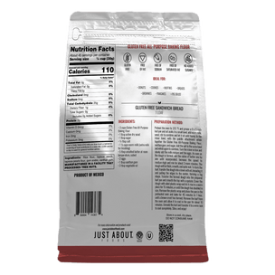 In a large bowl, combine Just About Foods Gluten-Free All-Purpose Flour, xanthan gum, salt, and sugar. In a separate bowl, dissolve the yeast in the warm milk and let it sit for 5 minutes until frothy. Add the yeast mixture and melted butter to the dry ingredients, and mix until a sticky dough forms. Cover the dough with a clean towel and let it rise for 1-2 hours, or until it doubles in size.