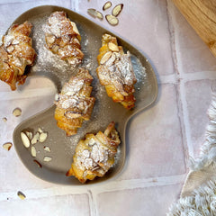 Once baked, remove the croissants from the oven and let them cool slightly. Sprinkle with sliced almonds and dust with powdered sugar before serving.