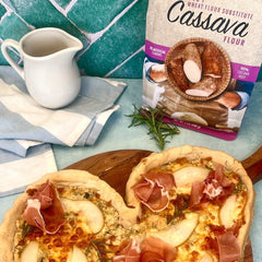 Activate the yeast by mixing it with warm water and sugar. Stir well and let it sit for 10 minutes until it ferments. In a large bowl, mix the cassava flour, salt, and olive oil. Add the activated yeast and mix until a smooth dough forms. Lightly knead the dough and cover it with plastic wrap. Let it rest for 20 minutes.