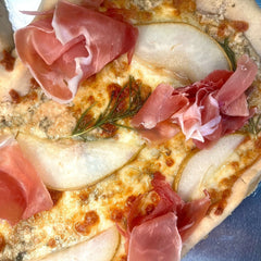 Once the dough has rested, roll it into a circle to fit the prepared pizza pan. Sprinkle the shredded mozzarella over the base. Add the pear slices, spreading them evenly. Place the prosciutto and gorgonzola over the pear slices.