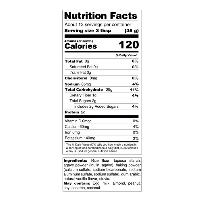 Rice flour, tapioca starch, agave powder (inulin, agave), baking powder, gum arabic, natural vanilla flavor, stevia.
