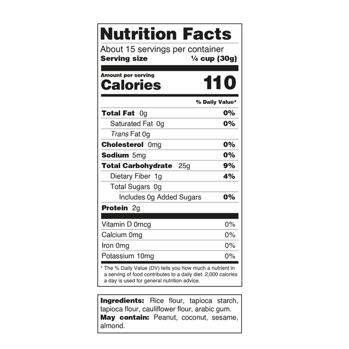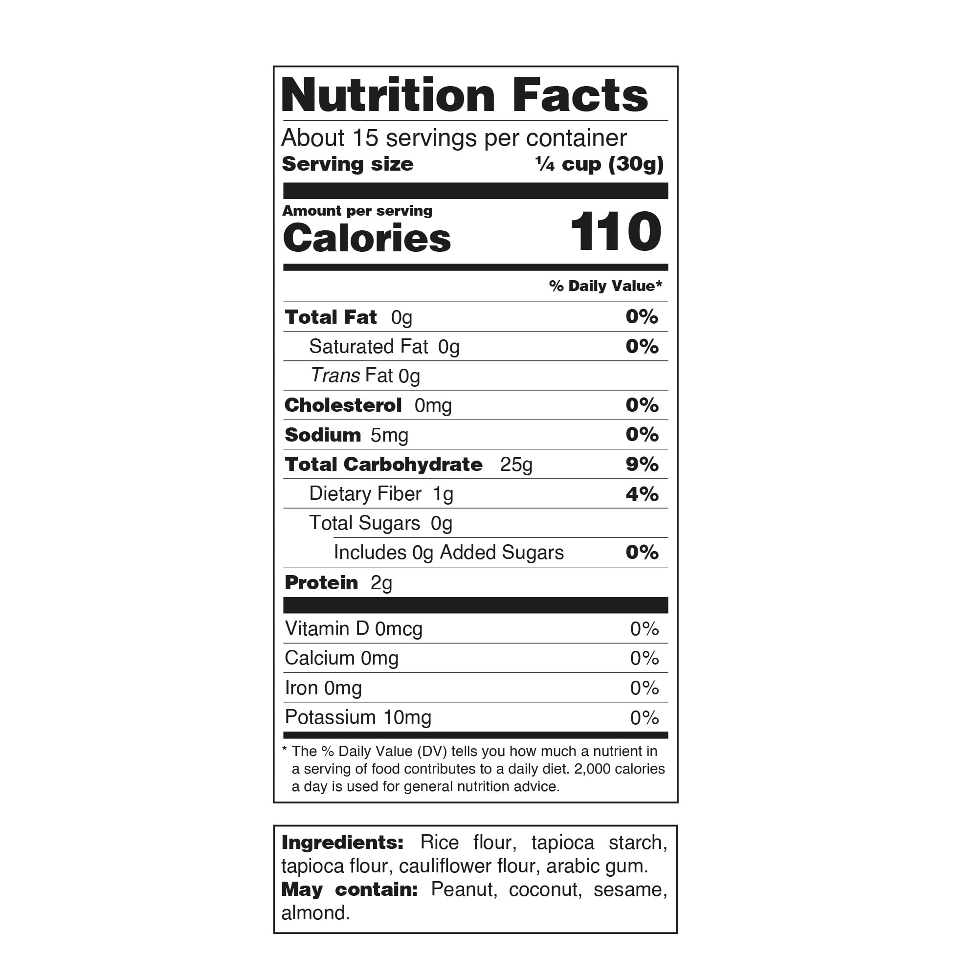 Rice flour, tapioca starch, agave powder (inulin, agave), baking powder (calcium sulfate, sodium bicarbonate, sodium aluminum sulfate, sodium sulfate), gum arabic, natural vanilla flavor, stevia.