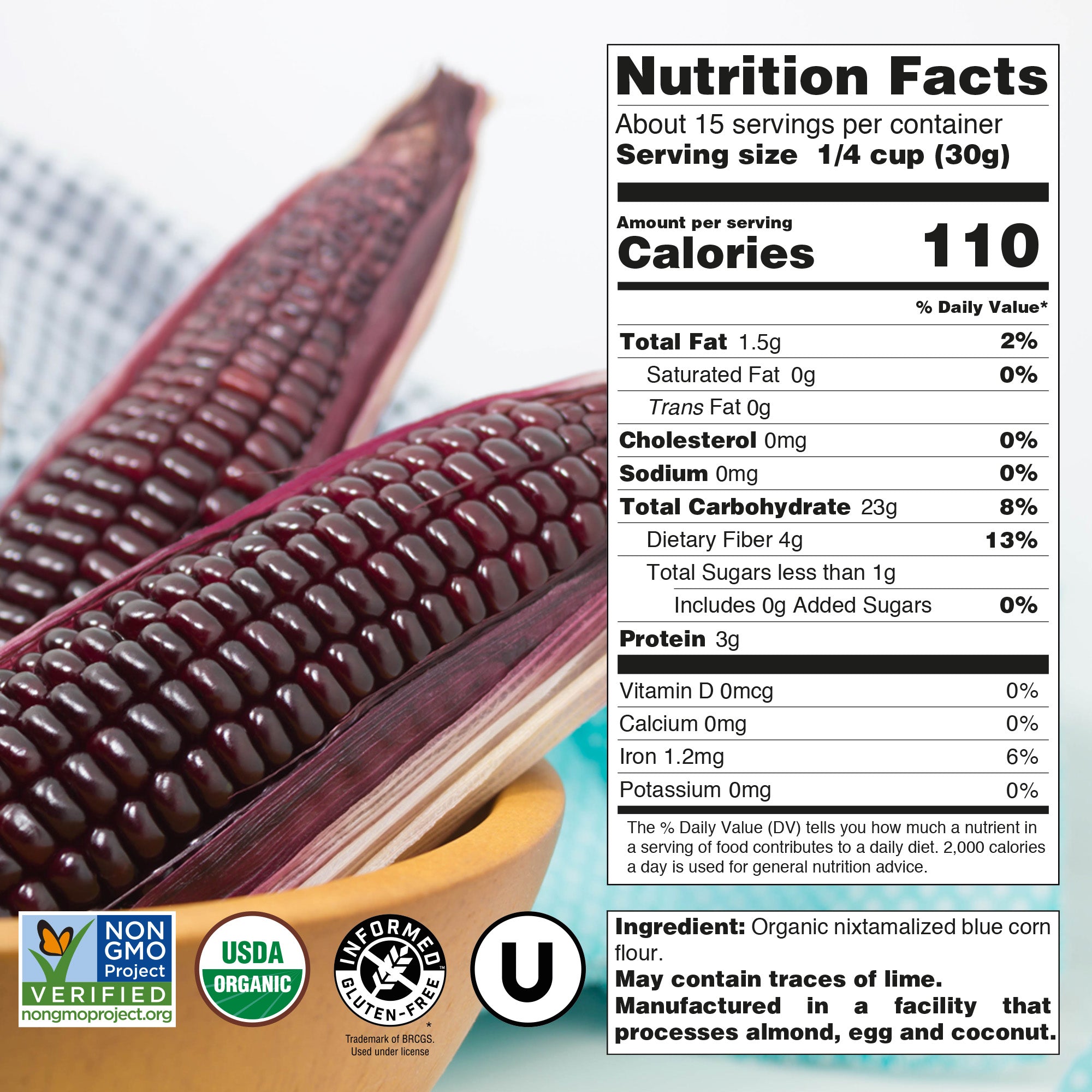 About the flour: This organic nixtamalized blue corn flour is a rich, naturally colored alternative to traditional flours.