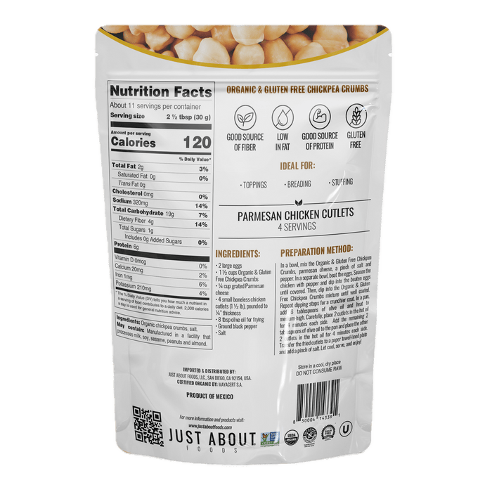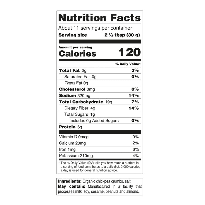 Crunchy, golden crumbs made from organic chickpeas and a touch of salt. A perfect gluten-free alternative to traditional breading, ideal for coating, crisping or topping your favorite recipes.