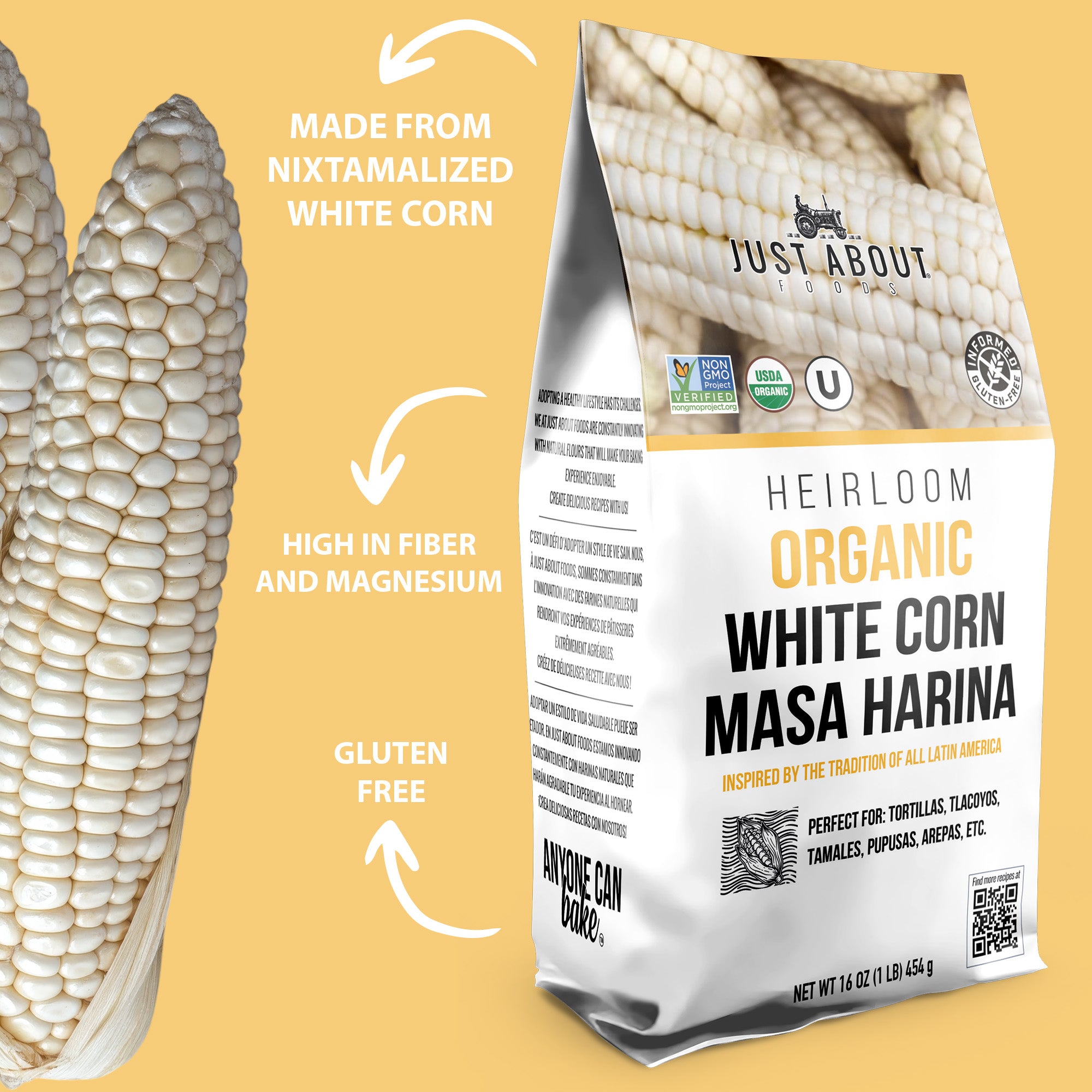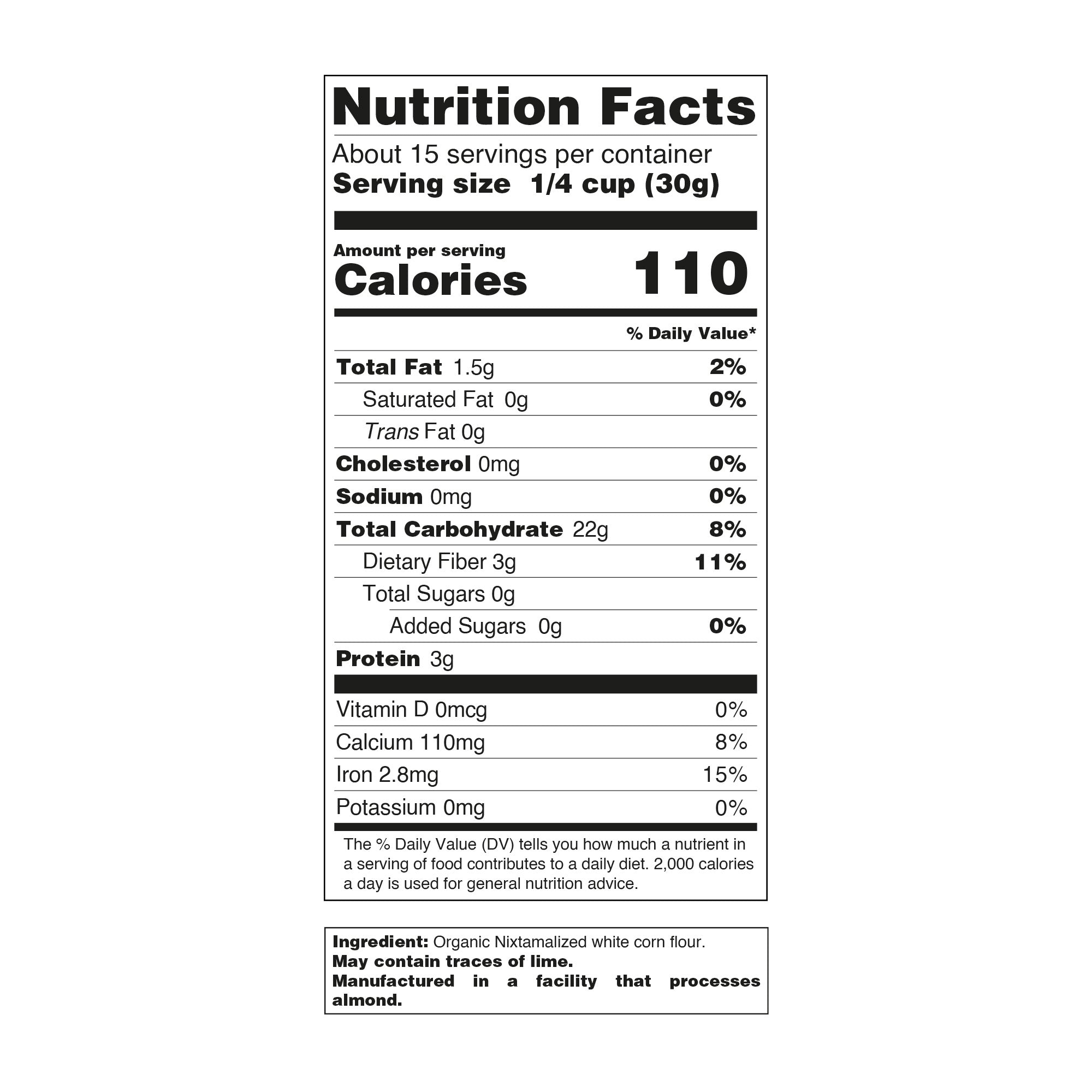 Organic nixtamalized white corn flour, vitamin and mineral premix (zinc oxide, electrolytic iron, Vitamin B3 (Niacin), Vitamin B1 (Thiamine Mononitrate), Vitamin B2 (Riboflavin), Folic Acid)